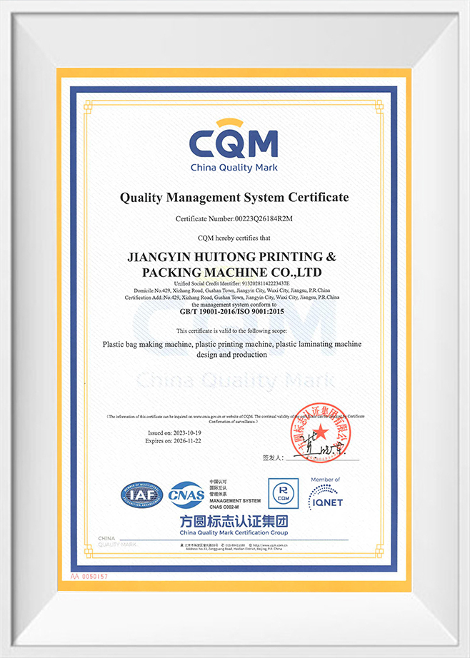 Jiangyin Huitong Packaging Machinery Co., Ltd. was established in 1996. It is located in the core area of the Yangtze River Delta Gushan Town, Jiangyin City, and covers an area of more than 100 acres. Professional produce a series of international advanced flexible packaging machinery. Now, Huitong has more than 500 employees. Among them, more than 50 are research and development inventors. The Mission of “facing to the world by innovation” leads Huitong to vigorously focus on research and development of new products. Huitong now has more than 400 patents, including 43 invention patents. Was rated “ High-tech Enterprise in Jiangsu Province”.